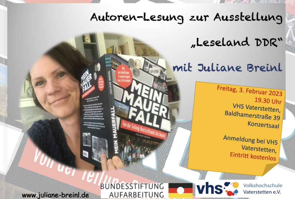Lesung in Vaterstetten am 3. Februar 2023 um 19.30, bitte melden Sie sich an. Der Eintritt ist kostenlos. Die Veranstaltung wird zudem auch gestreamt! https://www.vhs-vaterstetten.de/kurssuche/kurs/Leseland-DDR/O0106#inhalt