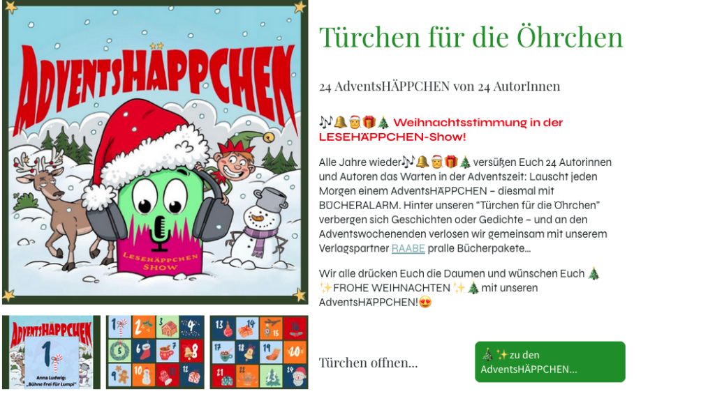 https://www.bücheralarm.de/adventshaeppchen Hinter den 24 Türchen warten vorweihnachtliche Hörgeschichten oder Gedichte verschiedener Kinderbuchautoren. Auch von mir ist wieder eine Geschichte dabei.