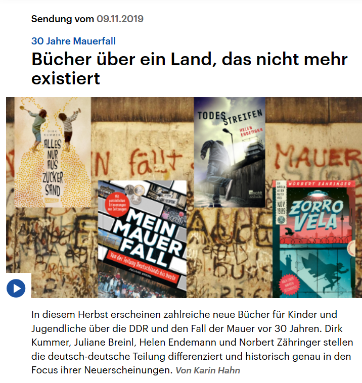 Zusammen mit drei anderen, sehr interessanten Neuerscheinungen zum Thema „Geteiltes Deutschland und Mauerfall“ , wurde am 9. November „Mein Mauerfall“ in der Rubrik „Bücher für junge Leser“ im Deutschlandfunk Radio besprochen. Zuvor hatte mich die Redakteurin Karin Hahn per „Schalte“ interviewt, was sehr aufregend war. Hier kann man die Sendung nachhören: https://www.deutschlandfunk.de/30-jahre-mauerfall-buecher-ueber-ein-land-das-nicht-mehr.1202.de.html?dram:article_id=462582